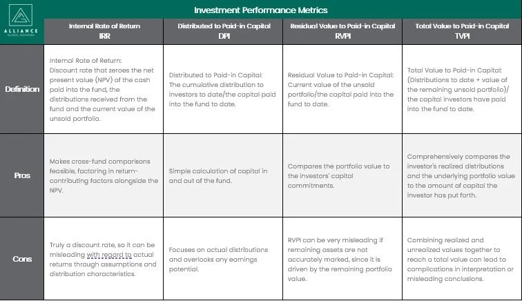 Focusing on a single metric, such as IRR, DPI, TVPI or RVPI, can provide an incomplete or even misleading view of performance. For instance, IRR may appear strong without meaningful capital returned, while DPI highlights realized gains but overlooks unrealized value. RVPI captures remaining value but can overstate results before full realization, and TVPI offers a blended view that may obscure timing and liquidity risks.