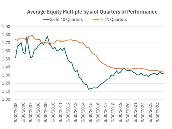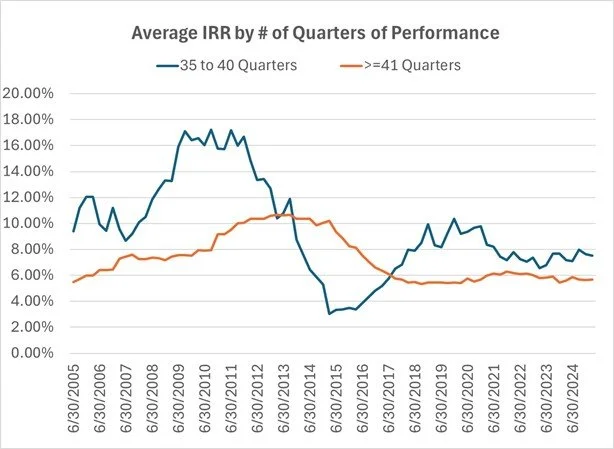 Townsend Group provided the charts below as an example. They illustrate average performance metrics for vehicles with 35–40 quarters of data compared to those with more than 41 quarters. The comparison highlights how time can influence performance, particularly when evaluating younger versus more seasoned vehicles. The variation in returns during market downcycles, as shown in the charts, underscores the importance of assessing all performance metrics when evaluating portfolios.